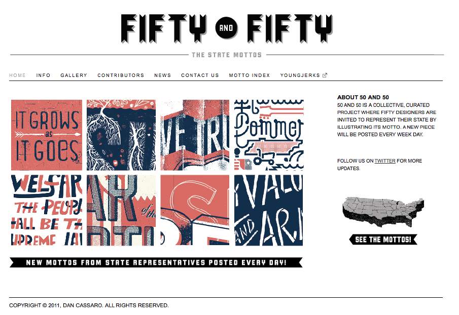 50 and 50 also started as a small, personal side project. He calls it a “designer’s atlas.” As a travelin’ man with a love for road trips, he dreamed up the idea of creating designs for each of the 50 state mottos. But quickly he realized it would take an incredible amount of work to do it all by himself. He came up with the idea of inviting other people to be part of the project to make the project even more rich. He recruited 49 other designers who each took on the awesome responsibility of representing their own state motto with their own designs. He reached out to some of his design heroes through the project to invite them to participate, and everybody – except for one person – said yes. It took a lot of work, a lot of managing logistics, and a lot of wrangling. Each step, the project gained more momentum, and now it’s complete with all 50 states represented by a powerhouse of designers. It’s a great example of how great ideas can have a snowball effect and how you just never know what someone will say until you ask them. Be sure to check out your own state and the 49 others here.